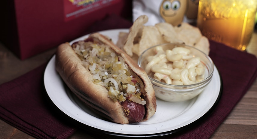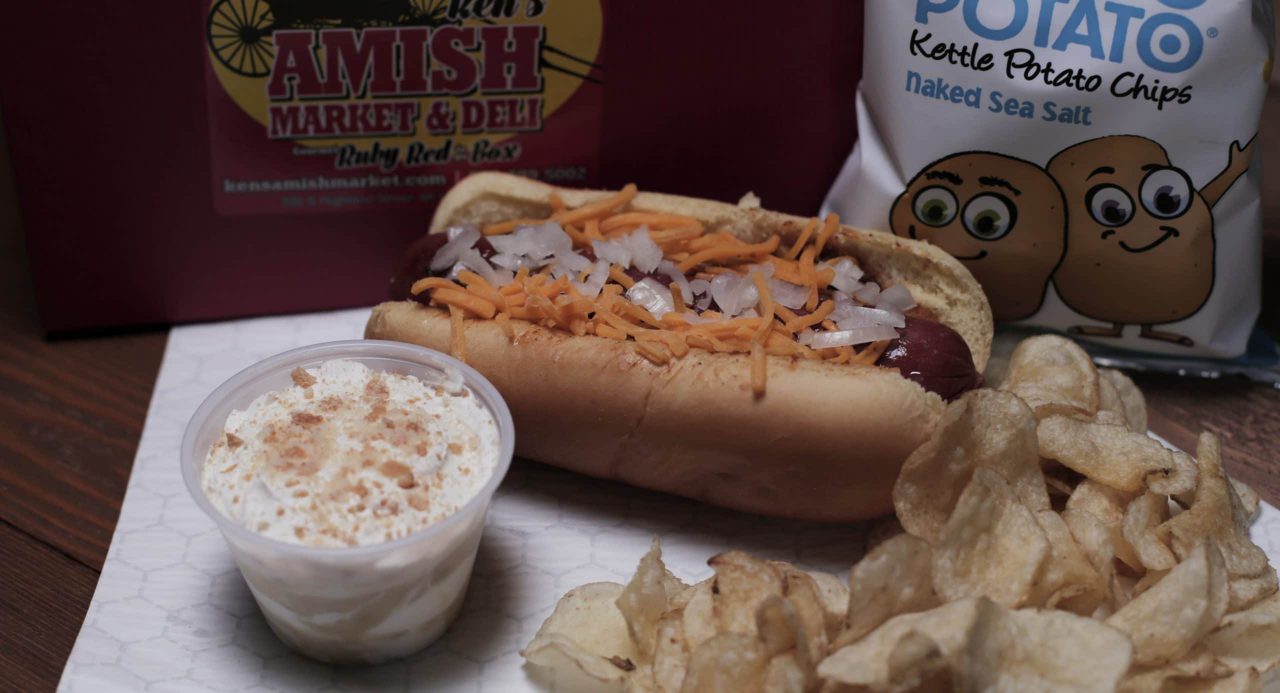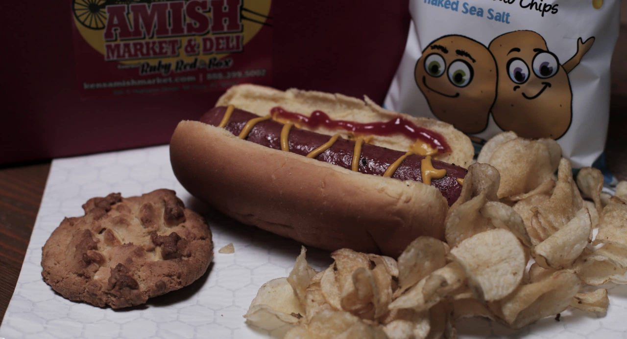100% Pure Beef Hot Dog with Amish Relish, Sauerkraut, Chow Chow, Garlic, Onion – Drink is Included.